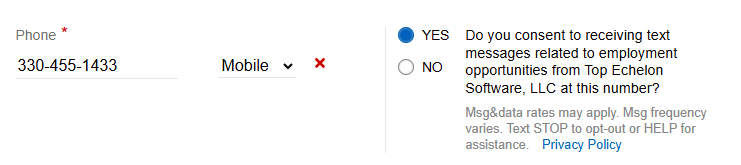 All phone number fields on Job Board and Careers Page applications include a checkbox where applicants can opt in to receive text messages from your agency. By providing this option at the time of initial application, we are taking one of many steps to meet industry guidelines and to ensure messages continue being delivered.